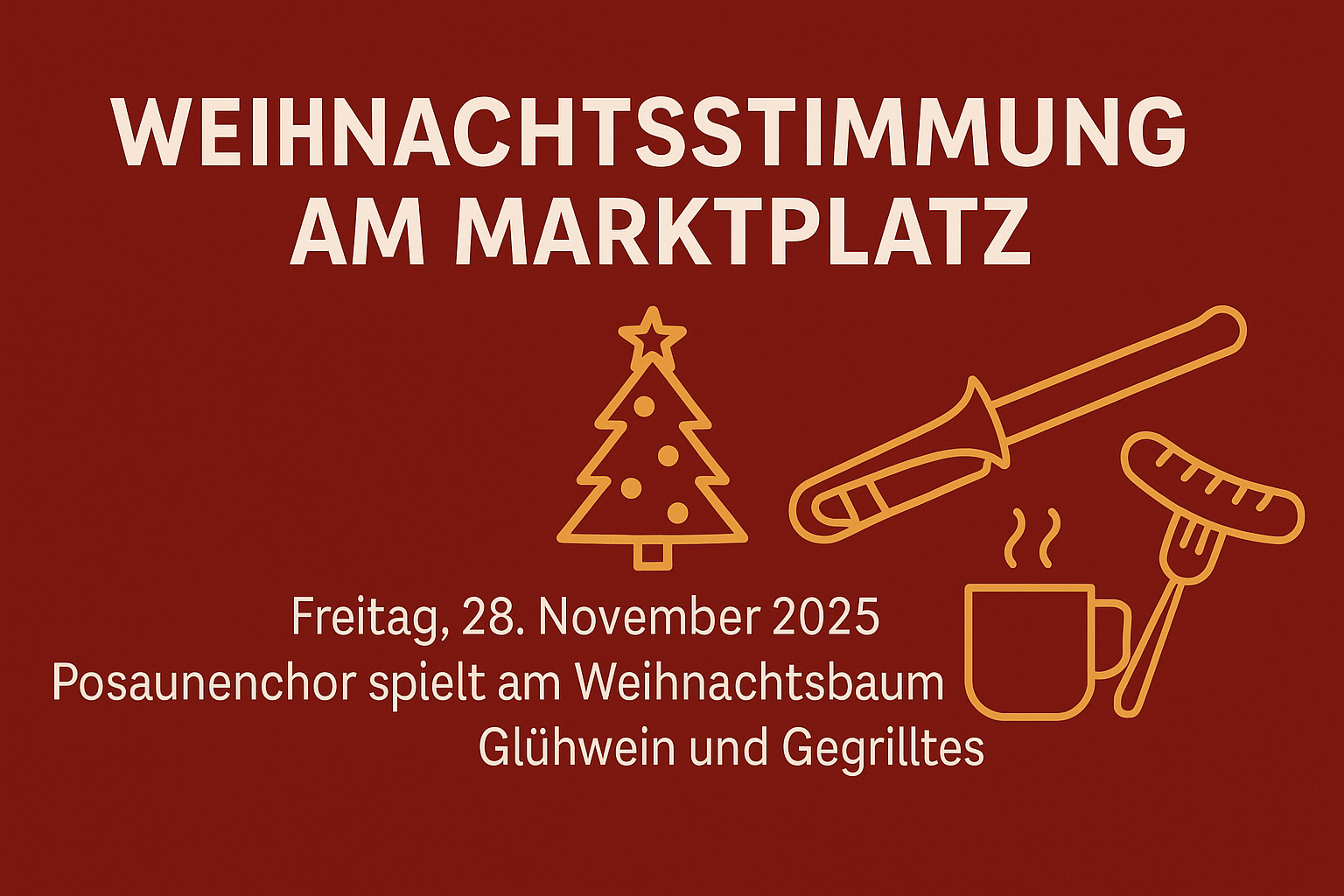 Am Freitag, den 28. November 2025, lädt der Posaunenchor Marktbergel ab 18:00 Uhr zum traditionellen Adventsauftakt ein. Direkt am festlich geschmückten Weihnachtsbaum auf dem Marktplatz erklingen stimmungsvolle Bläserklänge, die die Vorfreude auf die schönste Zeit des Jahres wecken.